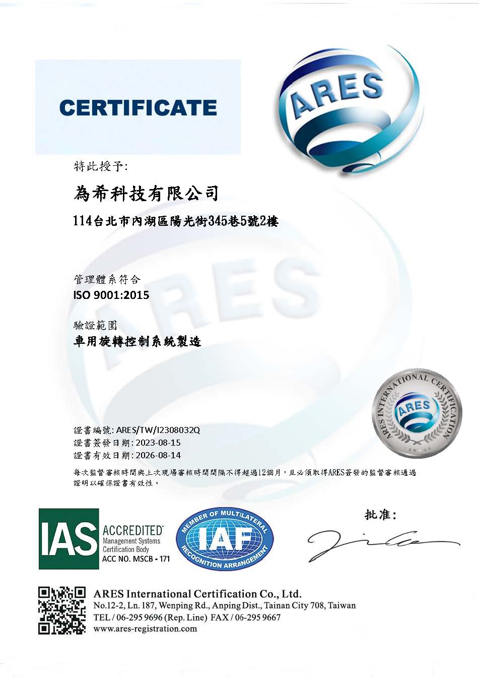 為希科技有限公司於2023年8月通過ISO 9001:2015評鑑,獲取IAS認可品質管理系統驗證證書。