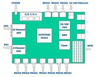 This module apply an interface which include Xilinx FPGA 4VFX60 and TI DSP C6701 that user can develop their application in ADC, DAC, RS232, RS422 and Ethernet